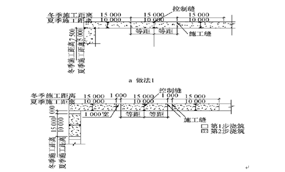 由于影響因素較多,理論上不好確定。目前,還沒有普遍能接受的方法來預測。但由于其受已澆筏板的約束,肯定比筏板的施工段短。根據(jù)經(jīng)驗,此距離一般設為5~7.5m。但每次澆筑5~7.5m,則嚴重影響施工進度,并增加了施工縫處理工序。一般情況下,是把此距離擴大1倍,達到10~15m,并在其中部位置設置控制縫。所謂控制縫,就是在一個澆筑段的中部人為地制造一個薄弱面,當混凝土開裂時,引導裂縫出現(xiàn)在該部位。本工程施工圖紙要求的施工段間距為,冬季15m,夏季10m。同時,在每段中部設置控制縫。如圖1a所示。注意下段混凝土的澆筑與上段混凝土的澆筑時間間隔至少要差36h,以便上段混凝土充分收縮。當不能滿足該條件時,按圖1b設置后澆帶。
