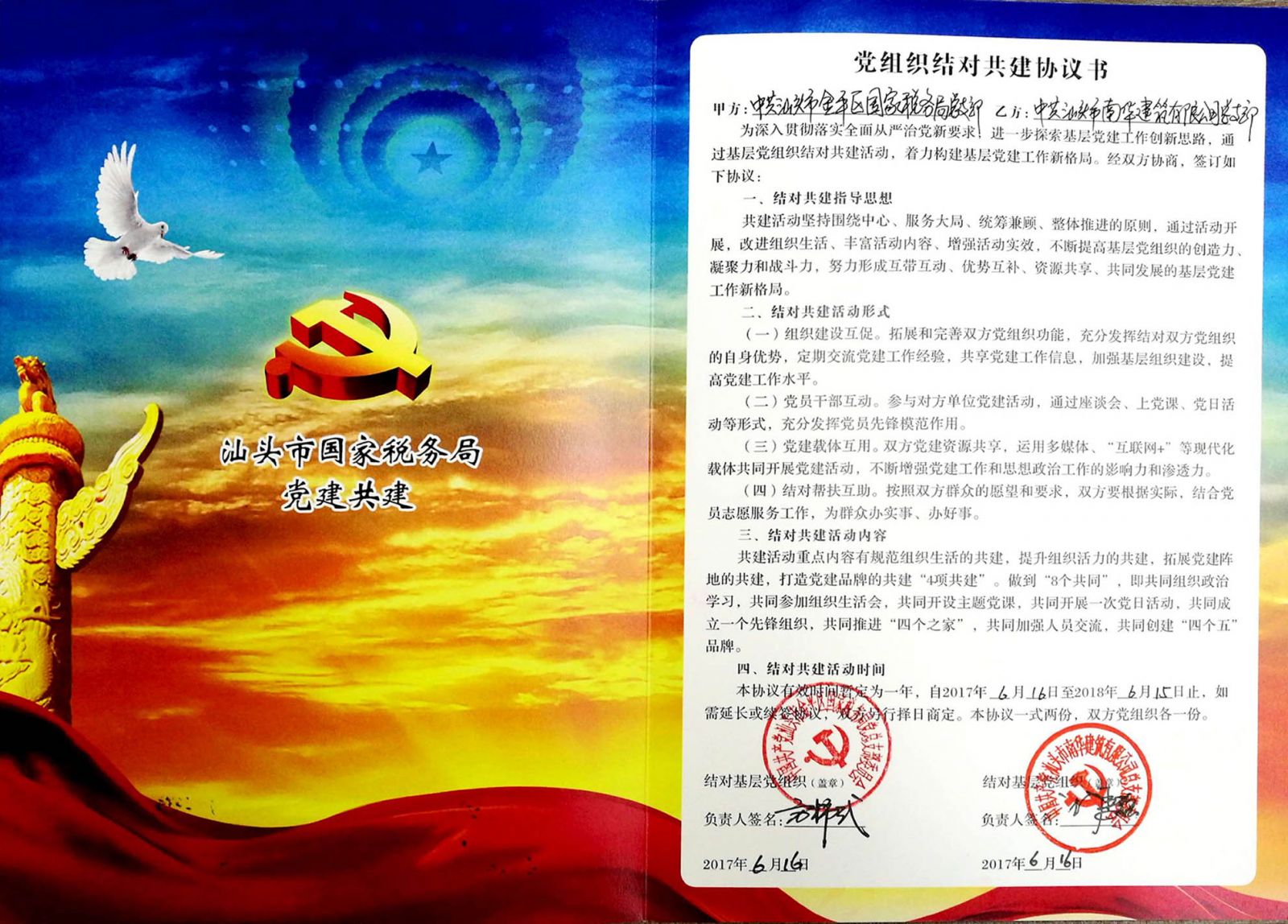 為貫徹落實(shí)全面從嚴(yán)治黨新要求,進(jìn)一步探索基層黨建工作創(chuàng)新思路,通過(guò)基層黨組織結(jié)對(duì)共建活動(dòng),著力構(gòu)建基層黨建工作新格局。為進(jìn)一步加強(qiáng)稅企雙向互動(dòng),構(gòu)造和諧稅企文化,6月16日,汕頭市金平區(qū)國(guó)家稅務(wù)局黨總支與我司黨總支結(jié)對(duì)共建活動(dòng)于我司舉行。
