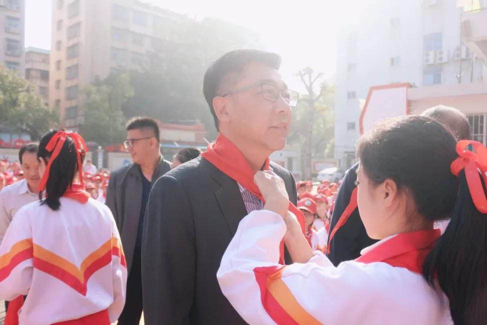 在宣布主題隊日活動開始時,學(xué)生們?yōu)榧钨e獻上紅領(lǐng)巾,并出隊旗、唱隊歌。
