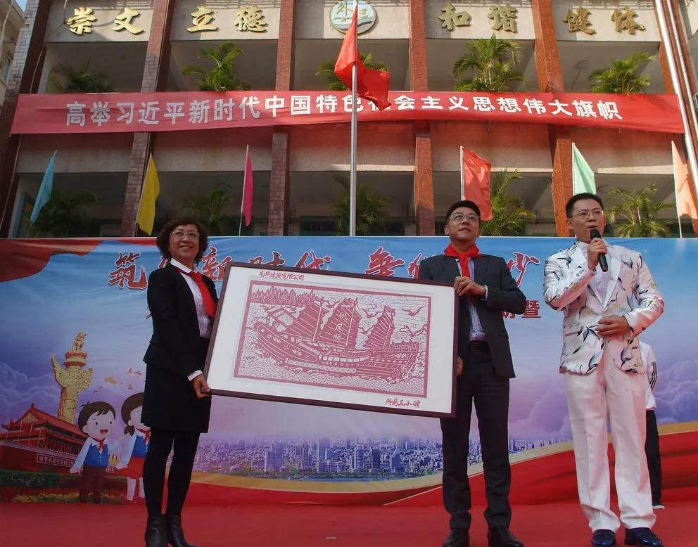 學(xué)校為了表達對林董事長誠摯的謝意,向我司贈送剪紙作品《一帆風(fēng)順》,這一幅剪紙是由汕頭市非遺傳承人陳小燕老師親自設(shè)計創(chuàng)作的,馮校長代表學(xué)校贈送作品,表達對南華公司的美好祝愿。