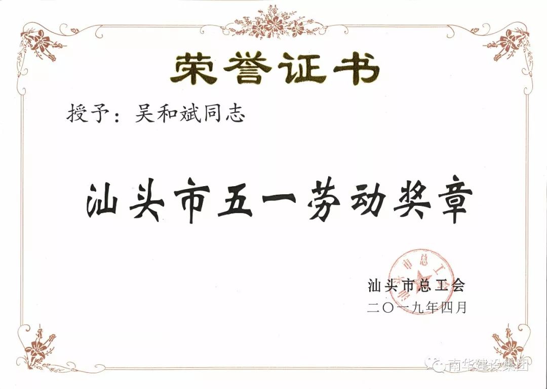 勞動創(chuàng)造價值,勞動創(chuàng)造美好,在“五一國際勞動節(jié)”這個屬于我們勞動者的歡樂節(jié)日到來之際,吳和斌同志作為集團(tuán)公司勞動者的代表,被授予“汕頭市五一勞動獎?wù)?rdquo;。