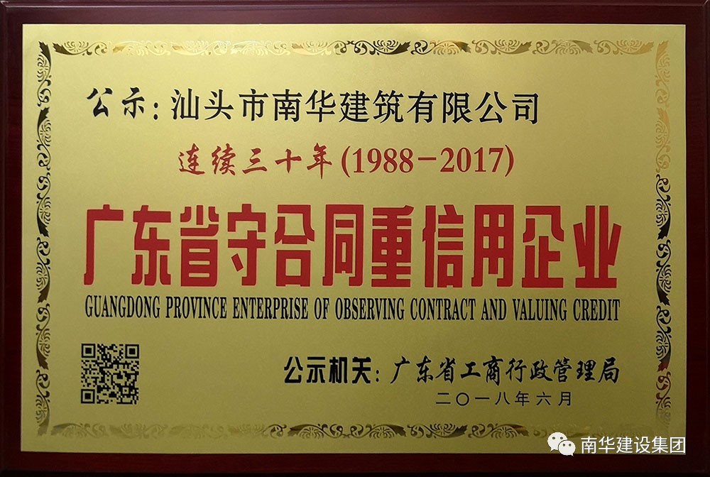誠信是企業(yè)的立身之本。 據(jù)了解,南華建設(shè)集團(tuán)有限公司連續(xù)多年被評為“廣東省誠信示范企業(yè)”和中國人民建設(shè)銀行廣東省分行確認(rèn)為建筑業(yè)AAA信用等級單位,自1988年至今連續(xù)30年被省、市評為“守合同重信用”企業(yè)。歷年來公司先后榮獲“國家建設(shè)部精神文明先進(jìn)單位”、“全國先進(jìn)集體建筑企業(yè)”、“全國安康杯競賽優(yōu)勝企業(yè)”、“全國模范職工小家”、“廣東省工人先鋒號”、“廣東省建設(shè)系統(tǒng)優(yōu)秀企業(yè)”、“省級先進(jìn)企業(yè)”、“廣東省文明單位”、“全省建設(shè)系統(tǒng)先進(jìn)單位”、“廣東省建筑工程文明施工年活動先進(jìn)單位”;連續(xù)獲汕頭市建設(shè)委員會授予“先進(jìn)施工企業(yè)”稱號,并多次榮獲汕頭市“先進(jìn)單位”、“文明單位”、“先進(jìn)職工之家”、“優(yōu)秀民營企業(yè)”等光榮稱號。“信守合同”與“文明”建設(shè)同步發(fā)展是企業(yè)南華建設(shè)集團(tuán)有限公司賴以發(fā)展壯大的堅實基礎(chǔ)。