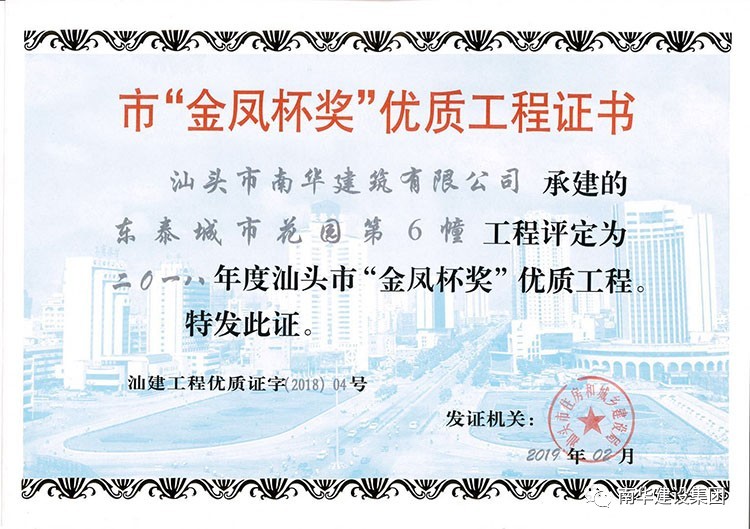 我司一直堅(jiān)持“科學(xué)管理、創(chuàng)時(shí)代精品”的理念,不斷創(chuàng)新思路,加強(qiáng)對精品工程施工質(zhì)量的把控,嚴(yán)格每道工序的檢查驗(yàn)收和監(jiān)督管理,一步一腳印,秉持匠心,精工雕琢每一寸建設(shè)空間,為美好城市建設(shè)和幸福居住環(huán)境留下南華的印記。近日,由我司承建的東泰城市花園第6幢項(xiàng)目獲2019年度“廣東省建設(shè)工程優(yōu)質(zhì)獎(jiǎng)”,在爭先創(chuàng)優(yōu)的印記上又留下閃亮的一筆。