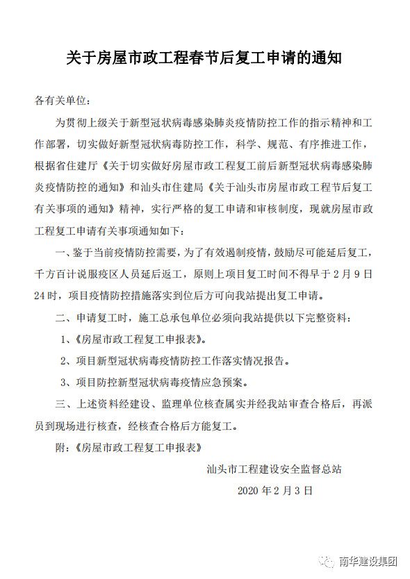 關(guān)于房屋市政建設(shè)工程春節(jié)后復(fù)工申請的通知