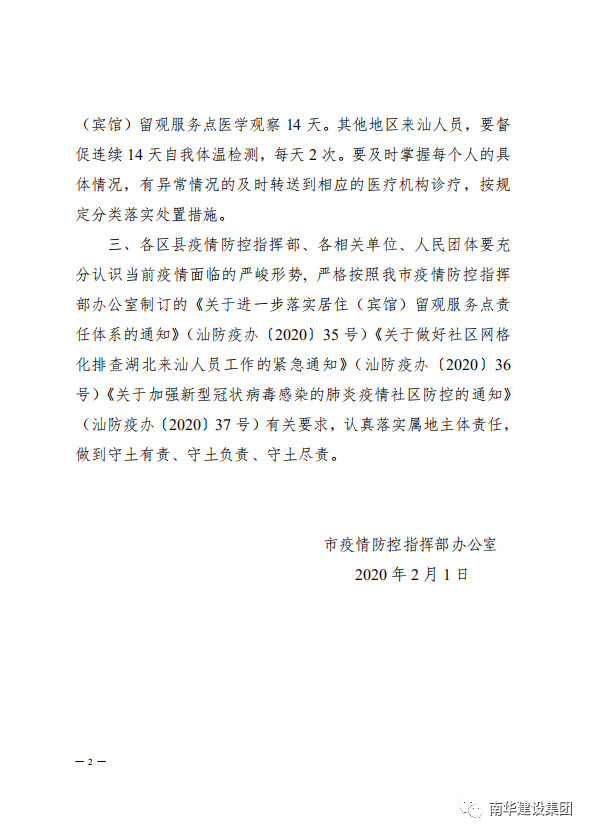 汕頭市疫情防控指揮部辦公室關(guān)于延遲疫情重點(diǎn)地區(qū)有關(guān)人員返汕時(shí)間的通知