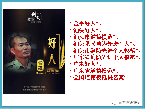 曾雄先生多年來堅(jiān)持見義勇為、助人為樂,其事跡廣為傳頌,先后獲得“汕頭好人”、“廣東好人”、“廣東省道德模范”、“全國道德模范提名獎”等。