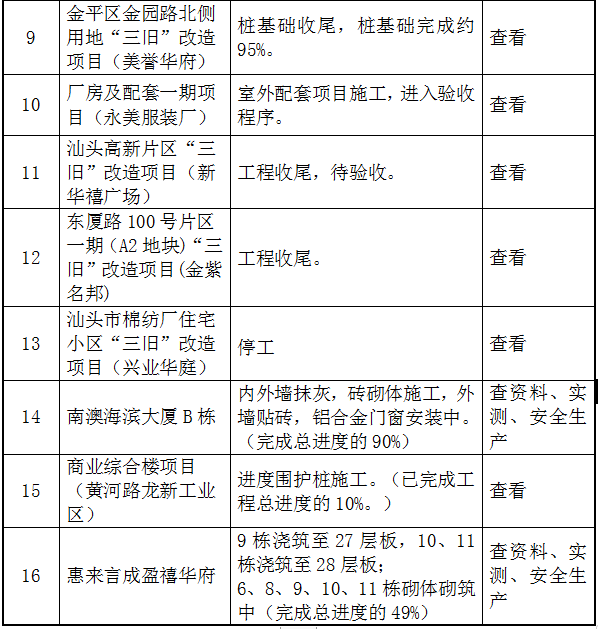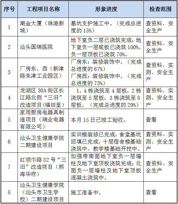 為強化建筑起重機械安全監(jiān)管工作,保障建筑施工安全生產(chǎn)形勢穩(wěn)定,根據(jù)汕頭市住建局文件通知,針對在建工程建筑起重機械安全專項檢查,我集團公司予以積極配合,對各在建工程項目建筑起重機械進行自查自糾,塔吊、施工電梯等起重機械設(shè)備的實體檢查、日常保養(yǎng)記錄、運行記錄、交接班記錄、操作人員持證上崗、安全交底及定期保養(yǎng)情況均能按規(guī)定要求落實實施,確保使用安全。