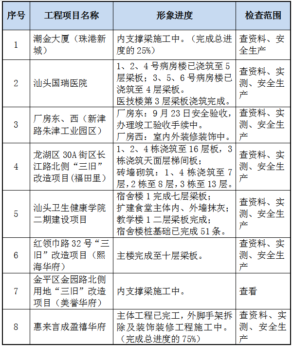 為深入貫徹落實習近平總書記關于安全生產的重要批示指示精神,根據省住建廳及汕頭市住建局文件通知,扎實推進房屋市政工程安全隱患集中排查整治工作及根據,針對建筑工程深基坑專項排查整治情況檢查,我集團公司嚴格按照文件精神,對在建工程深基坑項目進行自查自糾,各在建項目目前階段設計深基坑的項目能按照施工前組織工程技術人員編制專項施工方案及專家論證,且論證內容及手續(xù)均符合規(guī)定要求,施工現場危險區(qū)域設置安全警示標志,嚴格按照方案進行交底、按照規(guī)定進行施工監(jiān)測及安全巡視。