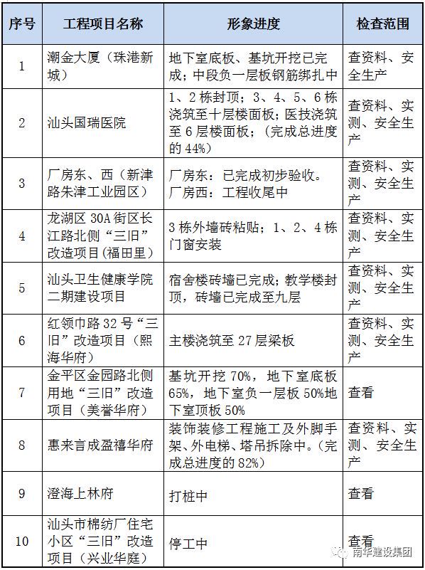 為深入貫徹習近平總書記關于安全生產(chǎn)的重要論述和重要批示指示精神,認真落實省住建廳、市委、市政府工作部署,扎實開展全市房屋市政工程“安全生產(chǎn)檢查月”及安全隱患集中排查整治工作,進一步提升我市房屋市政工程安全管理水平和能力,根據(jù)《廣東省住房和城鄉(xiāng)建設廳關于印發(fā)<2020 年度全省房屋市政工程安全隱患集中排查整治工作實施方案>的通知》、《汕頭市安委辦關于轉發(fā)省安委會印發(fā)的安全生產(chǎn)領域八大專項整治方案的通知》精神,集團公司決定從10月份起至2020年底對公司在建工程開展房屋市政工程“安全生產(chǎn)檢查月”及安全隱患集中排查整治工作專項檢查。