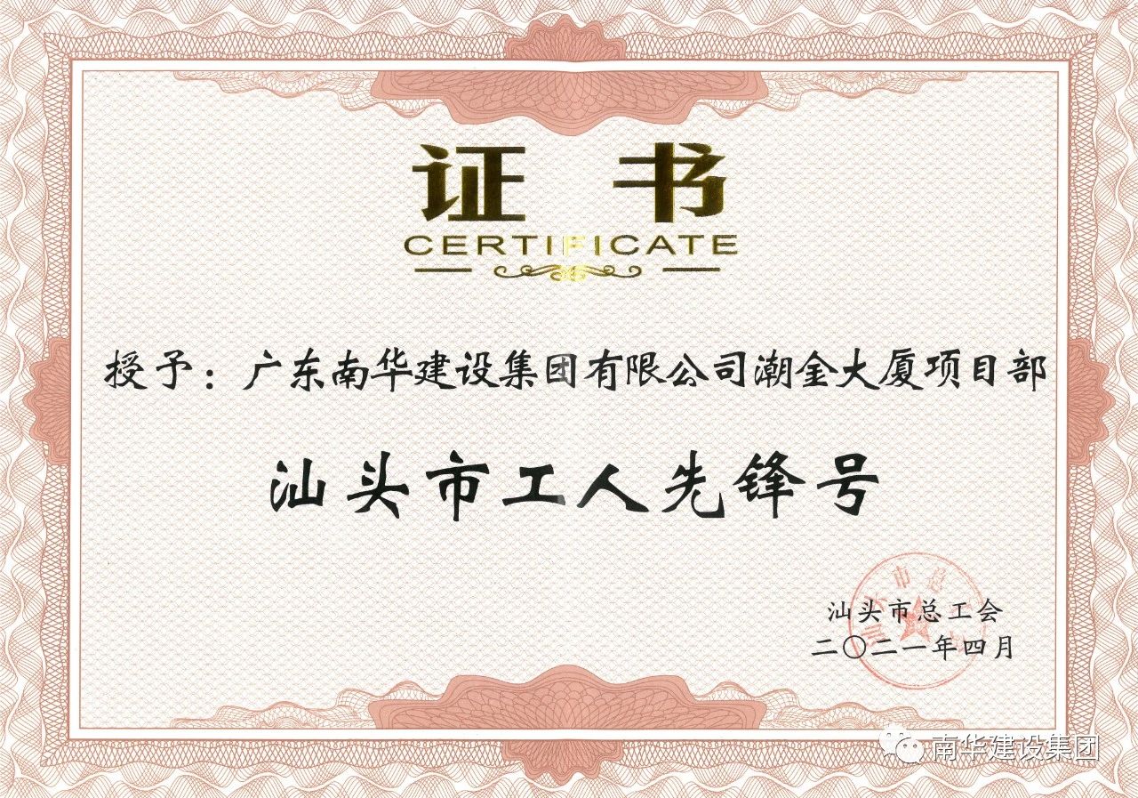 “五一”國(guó)際勞動(dòng)節(jié)來臨之際,4月30日下午,市委市政府在市委會(huì)議中心大會(huì)堂召開汕頭市慶祝“五一”國(guó)際勞動(dòng)節(jié)大會(huì)。南華建設(shè)集團(tuán)“潮金大廈項(xiàng)目部”榮獲汕頭市 “工人先鋒號(hào)”稱號(hào)!潮金大廈項(xiàng)目部在公司領(lǐng)導(dǎo)班子和公司工會(huì)的帶領(lǐng)下,一直秉承“科學(xué)管理、創(chuàng)時(shí)代精品;誠(chéng)信服務(wù)、讓客戶讓客戶滿意”的質(zhì)量方針與“以質(zhì)取勝、信守合同”的企業(yè)精神,以精細(xì)化管理規(guī)范自己,以標(biāo)準(zhǔn)化建設(shè)要求自己,團(tuán)結(jié)奮進(jìn),銳意改革,狠抓建筑質(zhì)量與優(yōu)質(zhì)服務(wù),高效完成各項(xiàng)生產(chǎn)工作任務(wù)。2020年2月獲“汕頭市合格職工之家”稱號(hào),2020年7月獲“汕頭市金平區(qū)先進(jìn)集體”稱號(hào)。