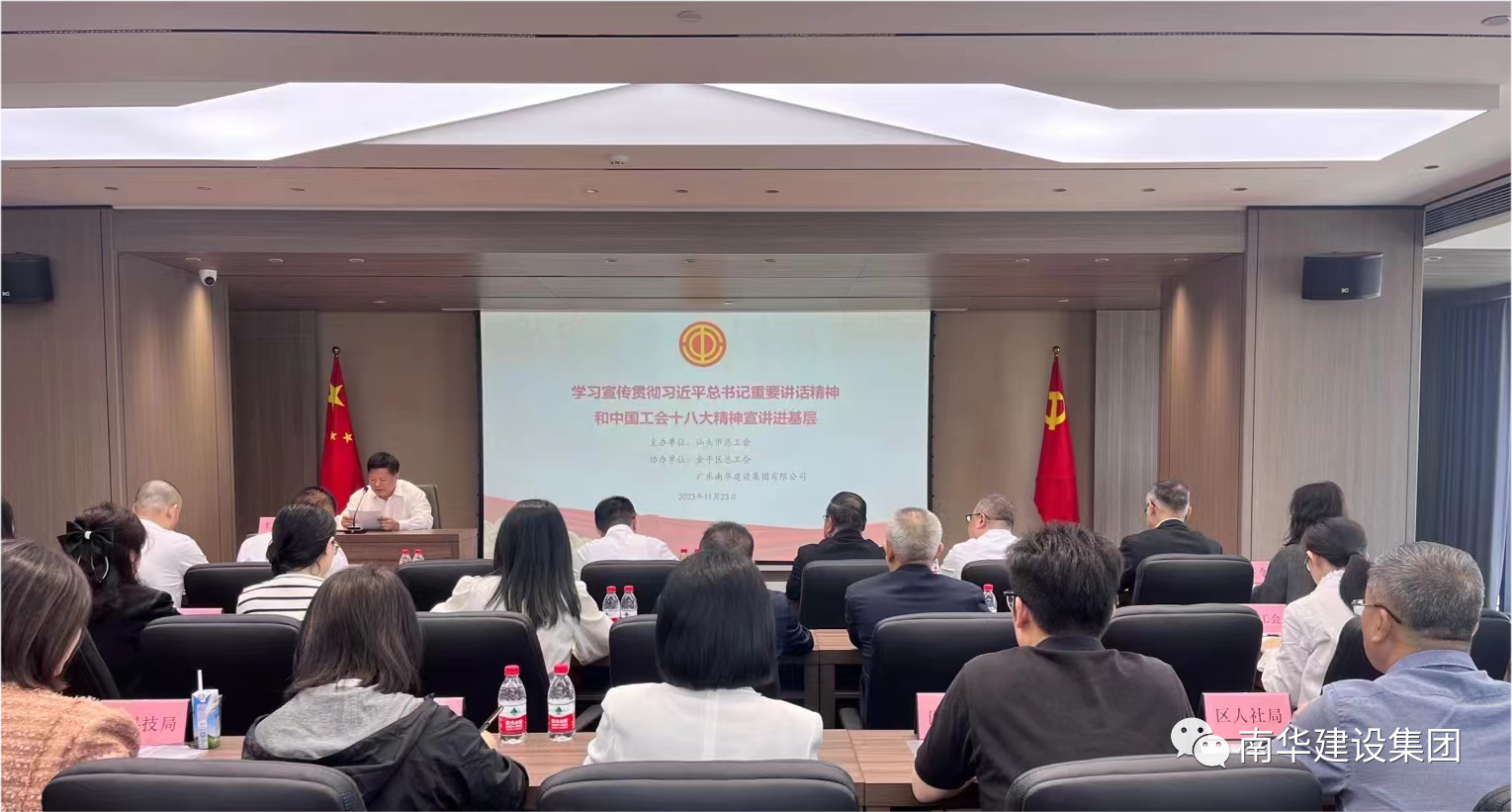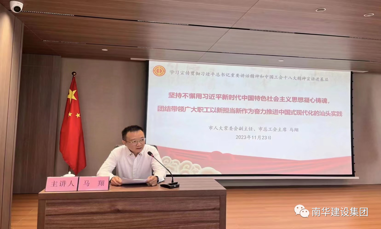 為深入學(xué)習(xí)貫徹黨的二十大精神以及習(xí)近平總書(shū)記同中華全國(guó)總工會(huì)新一屆領(lǐng)導(dǎo)班子成員集體談話時(shí)的重要講話精神,認(rèn)真貫徹落實(shí)中國(guó)工會(huì)十八大精神,切實(shí)用以武裝頭腦、指導(dǎo)實(shí)踐、推動(dòng)工作,更好引領(lǐng)廣大職工群眾聽(tīng)黨話、跟黨走,以實(shí)際行動(dòng)助力工會(huì)工作高質(zhì)量發(fā)展。11月23日上午,由汕頭市總工會(huì)主辦、金平區(qū)總工會(huì)協(xié)辦的學(xué)習(xí)貫徹習(xí)近平總書(shū)記重要講話精神和中國(guó)工會(huì)十八大精神主題宣講活動(dòng)在廣東南華建設(shè)集團(tuán)有限公司舉辦,市人大常委會(huì)副主任、市總工會(huì)主席馬翔出席活動(dòng)并作專(zhuān)題宣講,市、區(qū)總工會(huì)有關(guān)領(lǐng)導(dǎo)同志及我市的中國(guó)工會(huì)十八大代表、工會(huì)干部和職工代表參加學(xué)習(xí)。