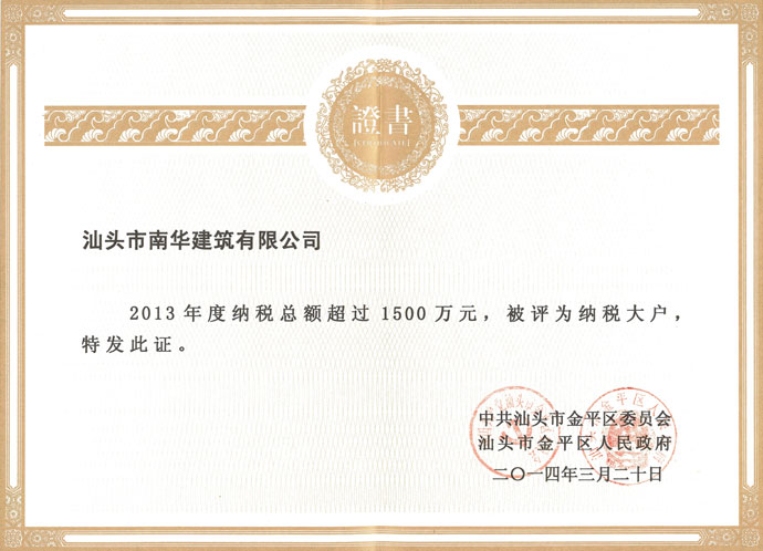 2014年度納稅大戶證書