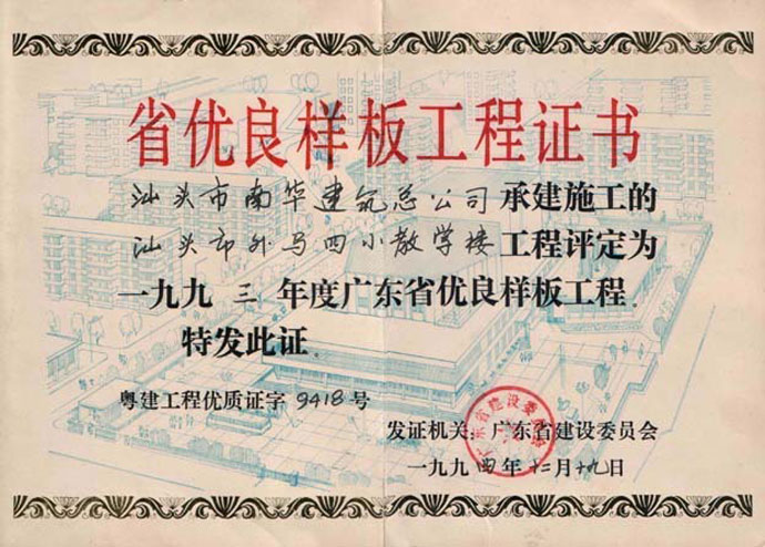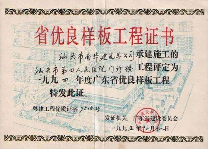 中國乒乓球汕頭基地雙優(yōu)工地證書